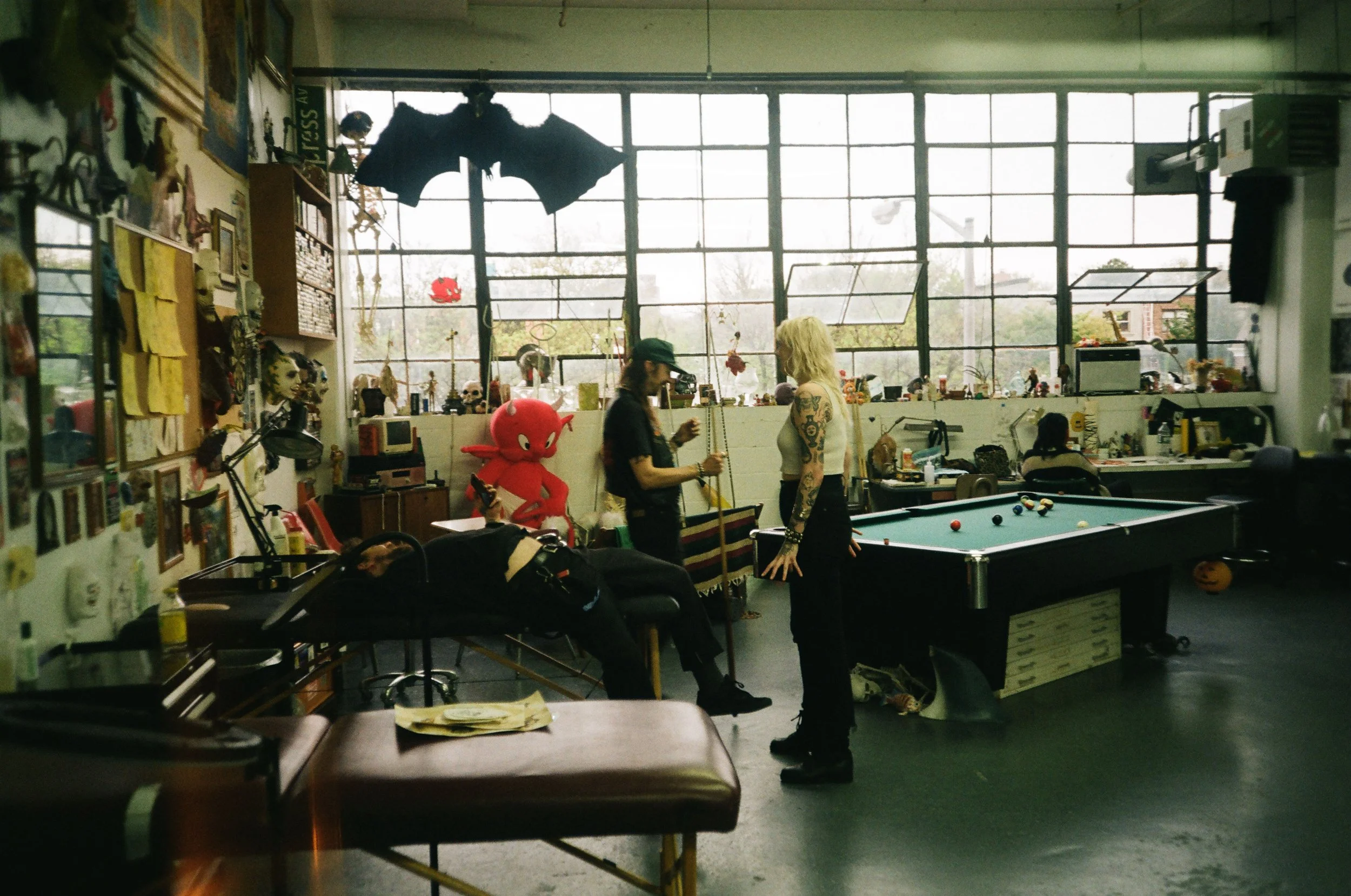 Laughs and a friendly game of pool at Spitball Tattoo. Brooklyn, NY 2022.