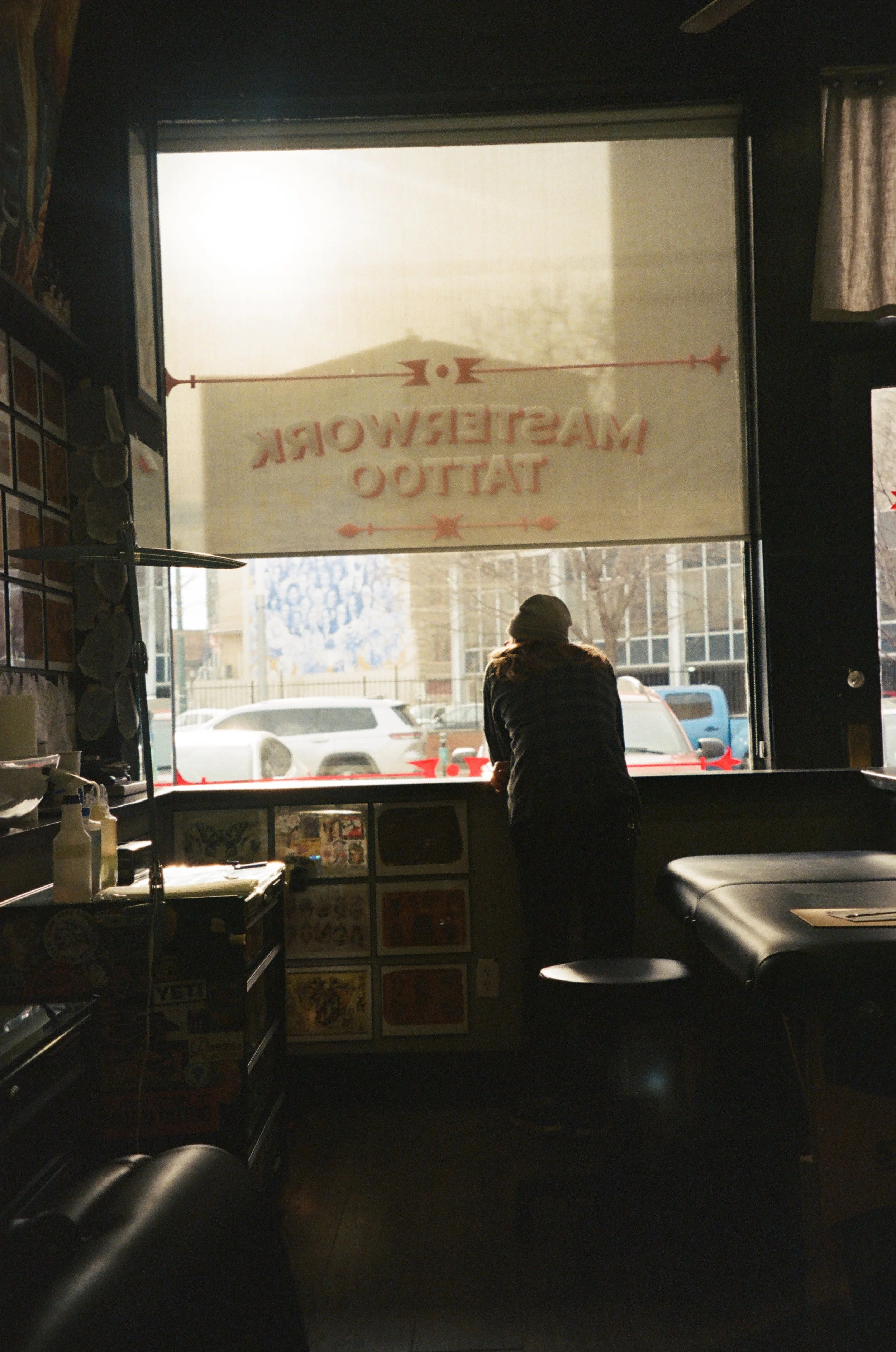 Patrick McGill gazing out the window on a slow day in 2024 at Masterwork Tattoo.